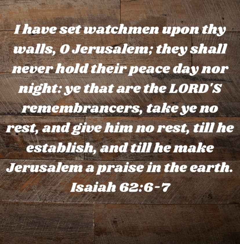 I was reading in Isaiah a while back and came across this verse in chapter 62. The revised 1885 version says it beautifully; ‘I have set watchmen upon thy walls O Jerusalem; they shall never hold their peace day nor night: Ye who are the Lord’s remembrancers take ye no rest and give Him no rest till He establish and till He make Jerusalem a praise in the earth.’
